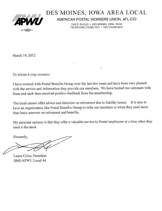 "I have worked with Postal Benefits Group over the last two years and have been very pleased with the service and information they provide our members. We have hosted two seminars with them and each time received positive feedback from the membership.
